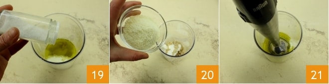 das Öl und eine Prise Salz hinzu 19. Fügen Sie auch den geriebenen Pecorino hinzu 20 und pürieren alles 21,