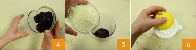 dann geben Sie sie in einen Mixer mit Klingen 4, fügen den geriebenen Käse hinzu 5; dann pressen Sie etwas Zitronensaft 6 aus und filtern ihn