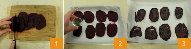 Um die Pasta mit drei Pestos zuzubereiten, beginnen Sie mit dem Rote-Bete-Pesto: Schälen Sie die Roten Bete und schneiden Sie sie in etwa einen halben Zentimeter dicke Scheiben 1. Legen Sie ein Backblech mit Backpapier aus und verteilen Sie die Rote-Bete-Scheiben darauf, sodass sie sich nicht überlappen. Bestreuen Sie sie mit Salz nach Belieben und gehacktem Thymian 2, beträufeln Sie sie mit etwas Öl und backen Sie sie im vorgeheizten statischen Ofen bei 200°C für 30-35 Minuten (bei Umluftofen bei 180°C für etwa 25-30 Minuten). Nach dem Garen 3 lassen Sie die Roten Bete abkühlen,