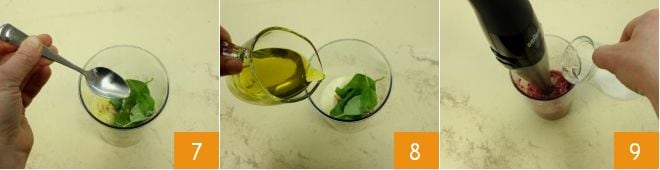 , um ein paar Tropfen zu den restlichen Zutaten hinzuzufügen, zusammen mit den Pinienkernen und den Basilikumblättern 7. Dann gießen Sie das Öl dazu 8 und pürieren alles mit dem Stabmixer, während Sie die flüssige frische Sahne langsam hinzufügen 9, bis Sie eine homogene Creme erhalten.