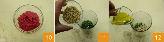 Den erhaltenen Pesto in eine kleine Schüssel geben 10. Setzen Sie die Zubereitung mit dem Majoran-Pesto fort: Entfernen Sie die Blätter von den Majoranzweigen, um nur die Blätter zu verwenden, und geben Sie sie in einen hohen Behälter, um sie zusammen mit den Pinienkernen 11 zu pürieren; fügen Sie das Öl hinzu 12,