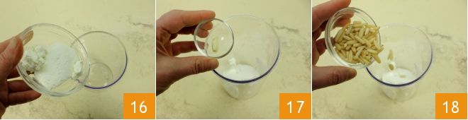 Zuletzt das Käse-Pesto zubereiten: Geben Sie den frischen Ricotta in den hohen Behälter 16, fügen Sie die halbe Knoblauchzehe 17, die Pinienkerne 18,