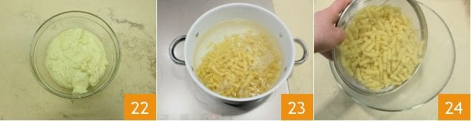 bis Sie eine homogene Mischung erhalten 22. In einem Topf Wasser zum Kochen bringen und die Pasta al dente kochen 23, dann abgießen und etwas Kochwasser aufbewahren, um sie in eine Schüssel zu geben 24.