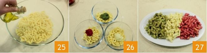 Würzen Sie sie mit etwas Öl 25 und teilen Sie sie auf drei Schüsseln auf, um sie mit den drei verschiedenen Pestos zu würzen 26 (falls nötig, fügen Sie etwas Kochwasser hinzu, um die Pasta cremiger zu machen). Auf diese Weise servieren Sie die Pasta mit drei Pestos in einem dreifarbigen Teller, um alle zu kosten 27!