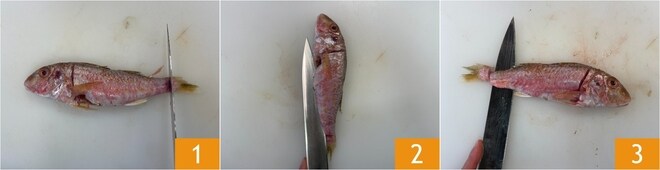 Um die Pasta mit einfachen Fischen zuzubereiten, beginnen Sie mit der Reinigung der Rotbarben: Schneiden Sie mit dem Messer unterhalb des Kopfes und oberhalb des Schwanzes ein 1, fahren Sie dann mit der Klinge über die Gräte entlang des Bauches auf beiden Seiten 2 und entfernen Sie schließlich die gewonnenen Filets 3. Machen Sie dasselbe auf der anderen Seite. Achten Sie darauf, dass der Kopf und der Schwanz an der zentralen Gräte bleiben und bewahren Sie die Reste auf, die Sie später für den Fond benötigen werden.