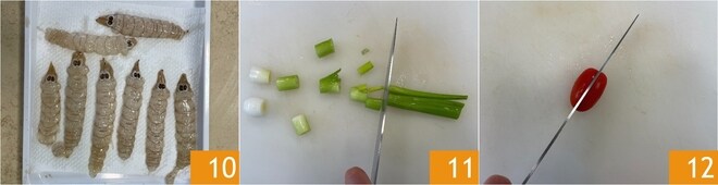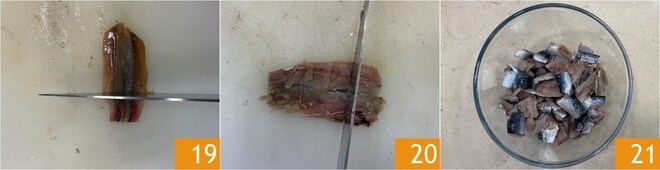 Schneiden Sie die Sardellen 19 und Sardinen in Stücke von der gleichen Größe wie die Rotbarben 20 und stellen Sie sie beiseite 21.