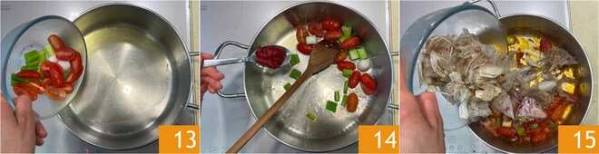 Geben Sie in einen Topf einen Schuss Öl, die Schalotte und die Kirschtomaten 13, fügen Sie dann das Tomatenmark hinzu und rösten Sie es bei starker Hitze für einige Minuten 14. An diesem Punkt fügen Sie die zurückgehaltenen Reste der Rotbarben und Krebse hinzu 15. Rösten Sie sie weitere 3-5 Minuten bei starker Hitze, indem Sie die Reste mit einem Kochlöffel gut zerdrücken, um alle Säfte herauszuholen.