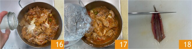 Nach ein paar Minuten fügen Sie die Sardinen, Sardellen 34 und die Rotbarben hinzu 35. Am Ende der Kochzeit fügen Sie die Krebse hinzu, die in sehr kurzer Zeit gar sind 36.