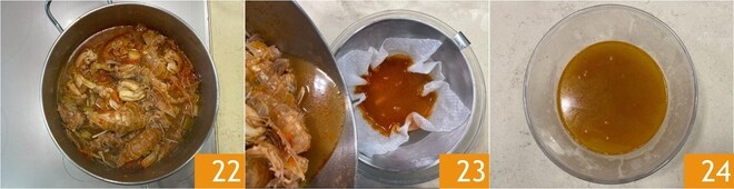 Nach der Kochzeit des Fonds 22 filtern Sie ihn durch ein mit einem nassen Papierhandtuch (oder Lebensmittelgaze) ausgelegtes Sieb, um alle Rückstände zu entfernen 23. Bewahren Sie den Fonds auf 24 und setzen Sie einen Topf mit Wasser auf, um die Pasta zu kochen.