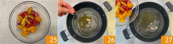 Um die Sauce zuzubereiten, schneiden Sie die kleineren Kirschtomaten in Hälften und die größeren in Viertel 25. In einem Topf braten Sie eine zerdrückte Knoblauchzehe und eine Chilischote mit einem Schuss Öl an 26, fügen Sie dann die Kirschtomaten hinzu 27.