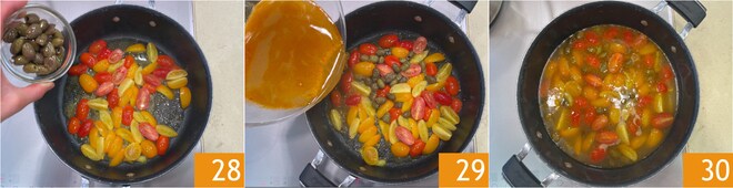 Braten Sie bei starker Hitze, fügen Sie dann die Oliven hinzu 28. Wenn die Kirschtomaten zu welken beginnen, geben Sie den Fond hinzu 29 und kochen Sie weiter, um ihn weiter zu reduzieren 30.