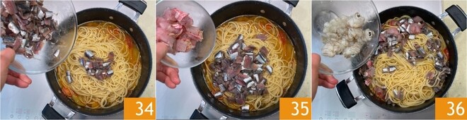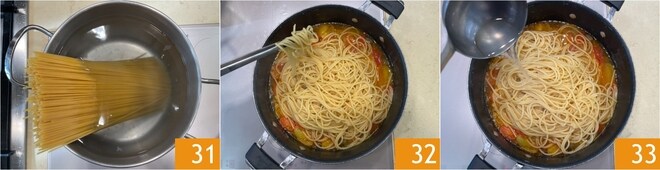 Inzwischen wird das Wasser zum Kochen gekommen sein, also salzen Sie und fügen Sie die Spaghetti hinzu 31. Gießen Sie die Spaghetti 4 Minuten vor Ende der Garzeit ab und geben Sie sie in die Pfanne mit der Sauce 32. Risottieren Sie die Pasta in der Pfanne bis zum Ende der Kochzeit, indem Sie sich mit einem Schöpflöffel ihres Wassers helfen 33.