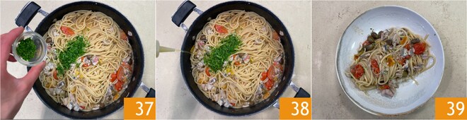 Nehmen Sie die Pfanne vom Feuer und duften Sie mit gehackter Petersilie 37, emulgieren Sie dann die Pasta, indem Sie das Öl in einem Faden einfüllen, während Sie umrühren; auf diese Weise wird es glänzend und cremig 38. Richten Sie an und servieren Sie sofort Ihre Pasta mit einfachen Fischen 39!