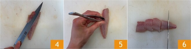 Schneiden Sie die Filets zurecht 4 und entfernen Sie die Gräten mit einer Küchenpinzette, indem Sie mit den Fingern danach suchen 5. Schneiden Sie schließlich die sauberen Filets in Stücke 6.