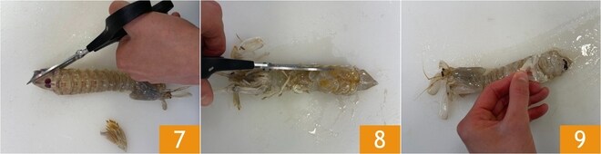 Fahren Sie mit der Wie man die Heuschreckenkrebse reinigt fort: Schneiden Sie mit einer Schere die Enden des Schwanzes ab, um ein Dreieck zu bilden 7, machen Sie dann Schnitte entlang der Seiten 8 und entfernen Sie den Panzer 9.