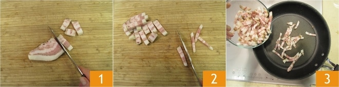Um die Pasta mit Erbsencreme und Guanciale zuzubereiten, beginnt ihr genau mit diesem. Schneidet ihn zunächst in Scheiben 1, dann daraus dünne Streifen 2. Gebt den Guanciale in eine heiße Pfanne 3