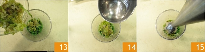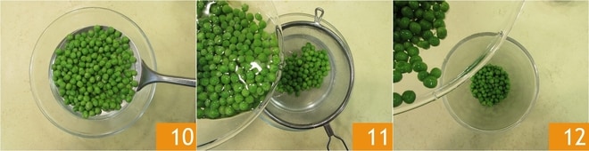 Verwendet einen Schaumlöffel, um die Erbsen herauszunehmen und in eine Schüssel mit sehr kaltem Wasser zu tauchen 10. Hebt den Topf mit Wasser auf, er wird für das Kochen der Pasta benötigt. Lasst die Erbsen erneut abtropfen 11; behaltet 1/3 davon und gebt die anderen in einen hohen Behälter 12