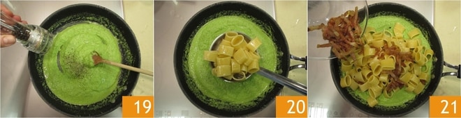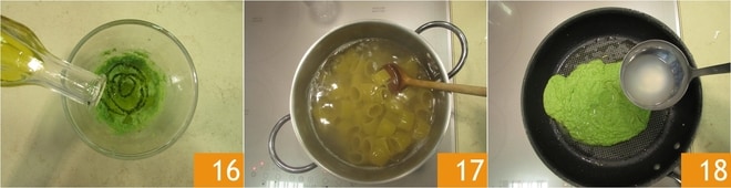 Fügt der Creme einen Schuss Olivenöl extra vergine hinzu 16, rührt um und stellt sie beiseite. Bringt das Wasser erneut zum Kochen und gebt die Pasta hinein 17. In der Zwischenzeit die Erbsen- und Lauchcreme in die Pfanne geben, eine Kelle Kochwasser hinzufügen 18