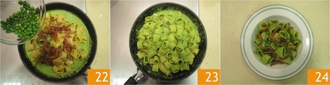 Fügt die restlichen Erbsen hinzu 22 und schwenkt die Pasta ein paar Minuten bei mittlerer Hitze 23. Richtet die Pasta an und dekoriert sie mit dem knusprigen Guanciale 24, dann serviert sie sofort!