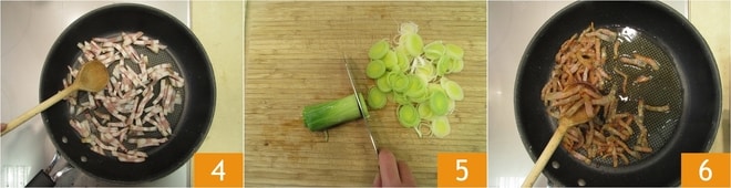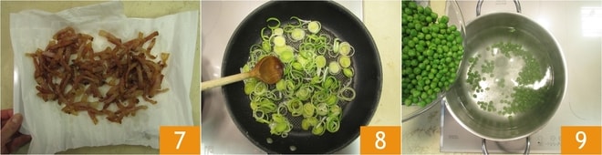 Legt ihn auf einen mit saugfähigem Papier ausgelegten Teller 7 und stellt ihn beiseite. Gebt in dieselbe Pfanne den geschnittenen Lauch 8 und lasst ihn bei mittlerer Hitze etwa 5 Minuten garen, bis er weich und goldbraun ist. Bringt in einem Topf mit gesalzenem Wasser zum Kochen, das für das Kochen der Pasta benötigt wird. Sobald es kocht, gebt die Erbsen hinein 9 und lasst sie ein paar Minuten garen.