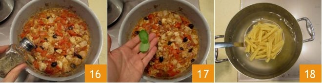 Salzen und pfeffern Sie nach Belieben 16 und lassen Sie alles weitere 5 Minuten kochen, gelegentlich umrührend. Dann schalten Sie die Hitze aus und aromatisieren Sie mit den Basilikumblättern 17. In der Zwischenzeit kochen Sie die Pasta im Topf mit gesalzenem, kochendem Wasser 18.