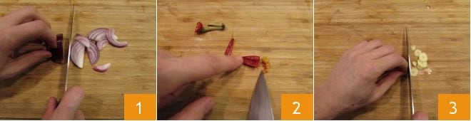 Um die Pasta mit Flussbarsch zuzubereiten, bringen Sie reichlich Wasser in einem Topf zum Kochen und salzen Sie es, sobald es kocht: Sie werden es später zum Kochen der Pasta benötigen. In der Zwischenzeit schälen und schneiden Sie die rote Zwiebel in Scheiben 1, dann entkernen Sie die frische Chili und entfernen die Samen 2, bevor Sie sie hacken. Schälen Sie den Knoblauch und schneiden Sie ihn sehr fein 3; wenn Sie möchten, können Sie ihn auch nur schälen und ganz lassen, um ihn vor dem Hinzufügen zur Pasta aus der Sauce zu entfernen.