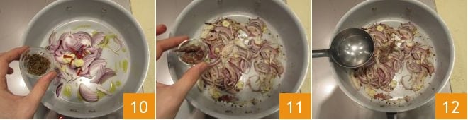 Fügen Sie auch die gehackten Kapern hinzu und lassen Sie alles bei mittlerer Hitze unter häufigem Rühren anbraten. Wenn die Zwiebel weich ist, geben Sie die Sardellenfilets hinzu, die aus dem Konservierungsöl abgetropft sind 11; dann gießen Sie mit einer Kelle des Kochwassers der Pasta auf, um das Kochen zu fördern 12.