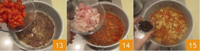 Nach ein paar Minuten, wenn die Sardellen geschmolzen sind, fügen Sie die Kirschtomaten hinzu 13, lassen Sie sie weitere 5 Minuten kochen, dann reduzieren Sie die Hitze und fügen Sie den Flussbarsch hinzu; rühren Sie sehr vorsichtig um und fügen Sie auch die Taggiasca-Oliven hinzu 15.