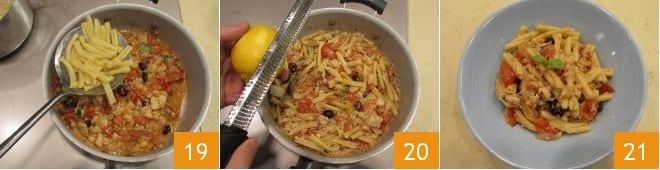 Wenn sie al dente ist, schöpfen Sie sie direkt in den Topf mit der Flussbarsch-Sauce, indem Sie die Hitze auf niedrig stellen 19, mischen und mit Zitronenschale aromatisieren 20; servieren Sie die Pasta mit Flussbarsch heiß 21!