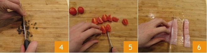 Nehmen Sie die Kapern, wenn sie in Salz eingelegt sind, müssen Sie sie unter kaltem, fließendem Wasser mehrmals abspülen, ansonsten hacken Sie sie direkt 4; dann kommen die Kirschtomaten: waschen Sie sie, entfernen Sie den grünen Stiel, falls vorhanden, und vierteln Sie sie 5; nehmen Sie das Flussbarschfilet, entfernen Sie eventuell vorhandene Gräten mit einer Küchenpinzette. Um sie zu entfernen, fühlen Sie die Oberfläche des Filets, um festzustellen, ob und wo sie vorhanden sind. Dann schneiden Sie das Filet in Streifen 6.