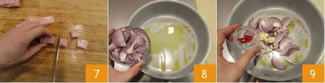 Schließlich in Würfel schneiden 7. Legen Sie den Fisch beiseite und geben Sie in einen Topf das Olivenöl, die Zwiebeln 8, den Knoblauch und die Chili 9.