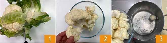 Um die Pasta mit gerührtem Brokkoli zuzubereiten, säubern Sie zuerst den Blumenkohl, indem Sie die Basis und die Blätter entfernen 1, dann teilen Sie die Röschen 2. Bringen Sie einen Topf mit gesalzenem Wasser zum Kochen und blanchieren Sie die Blumenkohlröschen für 8-10 Minuten 3.