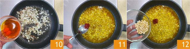 Geben Sie den Safran 10, das Tomatenmark 11 und die Pinienkerne 12 hinzu.