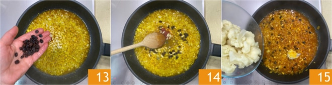 Fügen Sie die gut abgetropften Rosinen hinzu 13 und mischen Sie alles 14, dann geben Sie auch die Blumenkohlröschen dazu 15.