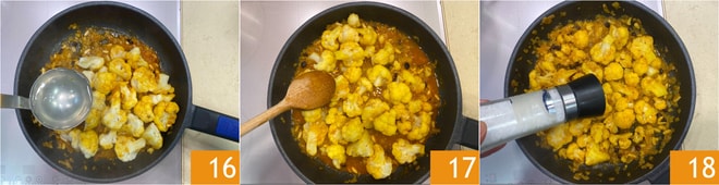 Geben Sie eine Kelle des Kochwassers hinzu 16 und kochen Sie für etwa 20 Minuten bei mittlerer bis niedriger Hitze, wobei Sie die Röschen mit der Kelle zerdrücken, um eine Art Ragout zu erhalten 17. Würzen Sie mit Salz und Pfeffer 18.