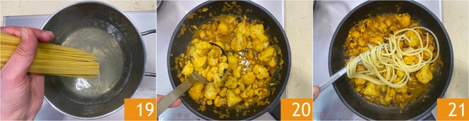 In der Zwischenzeit bringen Sie das Kochwasser des Blumenkohls erneut zum Kochen und kochen die Bucatini 19. Nach der Garzeit der Sauce nehmen Sie einen Teil davon für das Anrichten ab 20. Gießen Sie die Pasta sehr al dente ab und geben Sie sie in die Pfanne 21.