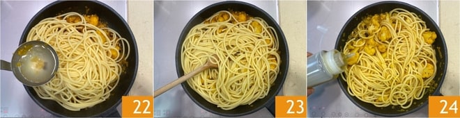 Fügen Sie etwas Kochwasser hinzu 22 und lassen Sie die Bucatini zusammen mit der Sauce fertig garen 23. Zum Schluss schwenken Sie mit einem Schuss Öl 24 und vermischen alles.