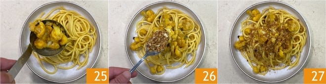 Vervollständigen Sie die Teller mit dem beiseitegestellten Saucenanteil 25 und einer Handvoll geröstetem Paniermehl 26. Ihre Pasta mit gerührtem Brokkoli ist servierfertig 27!