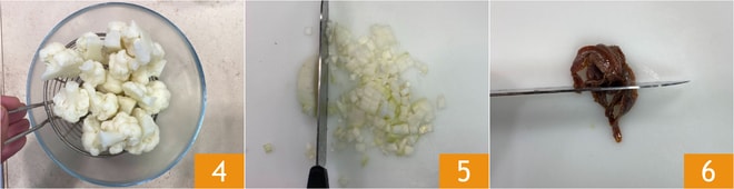 Gießen Sie die Blumenkohlröschen ab und bewahren Sie das Kochwasser auf 4. In der Zwischenzeit weichen Sie die Rosinen ein und lösen den Safran in wenig heißem Wasser auf. Hacken Sie die Zwiebel 5 und die Sardellenfilets 6.