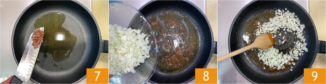 Erhitzen Sie einen Schuss Öl in einer großen Pfanne, dann fügen Sie die Sardellen 7 und die Zwiebel hinzu 8. Rühren Sie bei schwacher Hitze, um die Sardellen zu schmelzen 9.