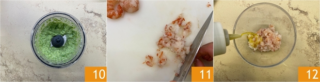 Mixen Sie alles zu einer homogenen und cremigen Masse 10. Nun reinigen Sie die Garnelen: Entfernen Sie Kopf, Schale und Darm (alle Details finden Sie in unserem Leitfaden "Wie man Garnelen reinigt"). Hacken Sie sie mit dem Messer 11 und geben Sie sie in eine Schüssel, dann würzen Sie sie mit einem Spritzer Öl 12 und einer Prise Salz.