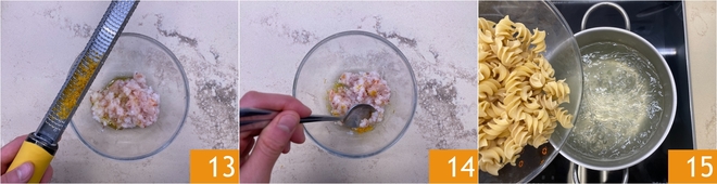 Fügen Sie auch die geriebene Orangenschale hinzu 13, mischen Sie gut 14 und stellen Sie beiseite. Kochen Sie die Pasta im selben Wasser, in dem Sie die grünen Bohnen gekocht haben, und das Sie inzwischen wieder zum Kochen gebracht haben 15.