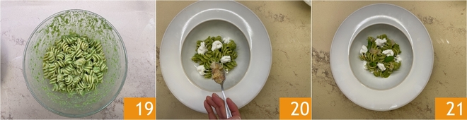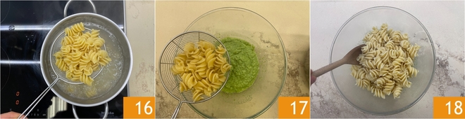 Kochen Sie die Pasta al dente 16 und geben Sie sie direkt in eine Schüssel, in der Sie zuvor das Pesto mit einer Kelle Kochwasser verlängert haben 17. Gut mischen 18.