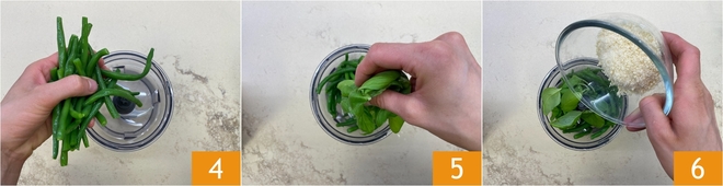 Geben Sie die grünen Bohnen in einen Mixer 4 zusammen mit dem Basilikum 5 und dem geriebenen Grana Padano 6.