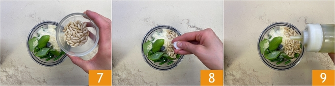 Fügen Sie auch die Pinienkerne 7, eine Prise Salz 8 und 10 g Öl hinzu 9.