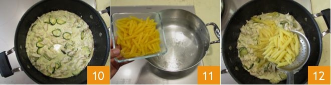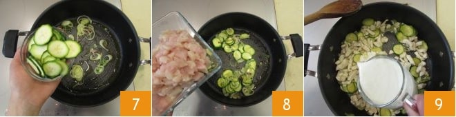 und geben Sie sie zum Anbraten hinzu 7. Warten Sie etwa ein paar Minuten und stellen Sie in der Zwischenzeit einen Topf mit gesalzenem Wasser auf den Herd, das für das Kochen der Nudeln benötigt wird. Sobald die Zucchini ihren Geschmack entfaltet haben, erhöhen Sie die Hitze und fügen die Hühnerwürfel hinzu 8. Kochen Sie ca. 10 Minuten, dann fügen Sie die Sahne hinzu 9