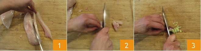 Um die Nudeln mit Huhn und Zucchini zuzubereiten, beginnen Sie als Erstes damit, die Hähnchenbrust zuerst in Streifen 1 und dann in Würfel 2 zu schneiden. Dann schneiden Sie die Frühlingszwiebel in dünne Scheiben 3