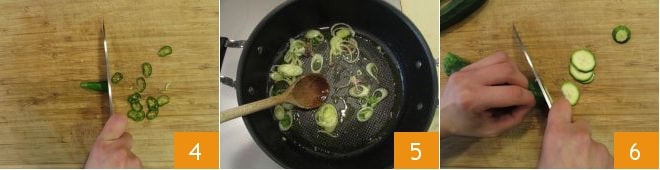 und die Chilischote in Ringe 4. Geben Sie das Öl in einen Topf, fügen Sie sowohl die Frühlingszwiebel als auch die Chilischote hinzu und lassen Sie sie sanft anbraten 5. In der Zwischenzeit schneiden Sie die Zucchini ebenfalls in ziemlich dünne Scheiben 6