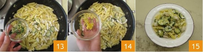 Mit Thymian 13, der Schale von 1 Zitrone 14 würzen, alles schwenken und Ihre Nudeln mit Huhn und Zucchini noch heiß servieren 15.
