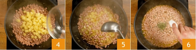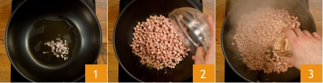 Um die Pasta mit Kartoffeln und Schinken zuzubereiten, beginnen Sie damit, die Fleischbrühe vorzubereiten, die warm gehalten werden sollte. Schälen Sie die Schalotte und hacken Sie sie fein, schneiden Sie dann auch den gekochten Schinken in Würfel und schälen Sie schließlich die Kartoffeln und würfeln Sie sie ebenfalls. Erhitzen Sie eine große Pfanne auf dem Herd, geben Sie 5 Esslöffel Öl hinein und fügen Sie die Schalotte hinzu; lassen Sie sie einige Minuten lang weich werden 1. Geben Sie den Schinken hinzu 2 und braten Sie ihn kurz an, bevor Sie mit Weißwein ablöschen 3.